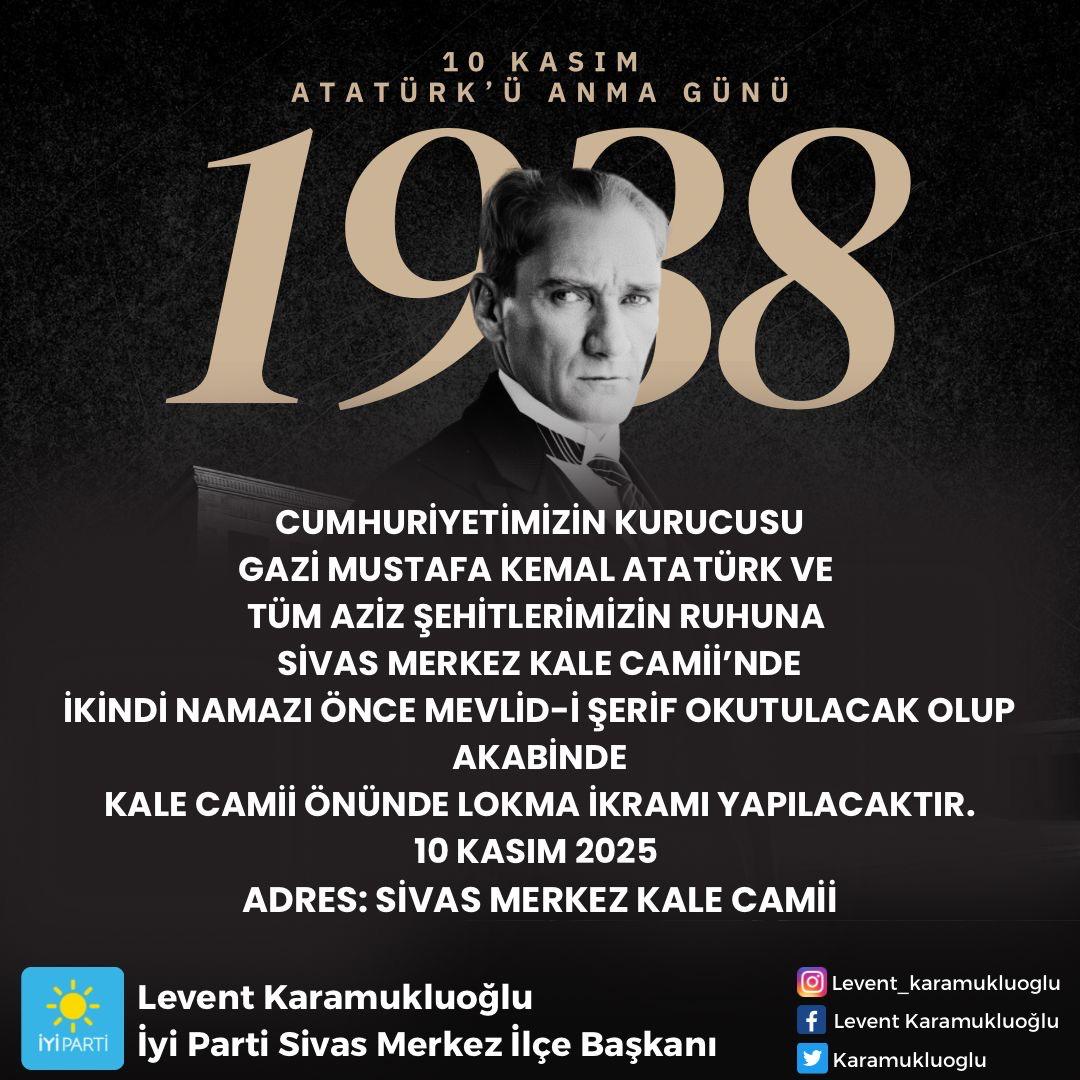 Cumhuriyetimizin kurucusu Gazi Mustafa Kemal Atatürk ve tüm aziz şehitlerimizin ruhuna ithafen, 10 Kasım 2025 Pazartesi günü Sivas Merkez Kale Camii’nde Mevlid-i Şerif programı düzenlenecek.