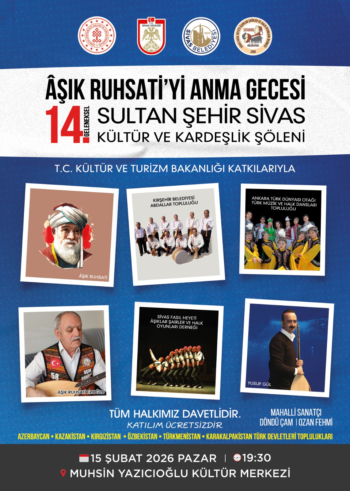 “Âşık Ruhsati’yi Anma Gecesi – 14. Geleneksel Sultan Şehir Sivas Kültür ve Kardeşlik Şöleni”, 15 Şubat 2026 Pazar günü gerçekleştirilecek.