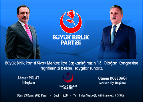 Büyük Birlik Partisi (BBP) Sivas Merkez İlçe Başkanlığı’nın 13. Olağan Kongresi, 23 Kasım 2025 Pazar günü saat 12.00’de Fidan Yazıcıoğlu Kültür Merkezinde gerçekleştirilecek.