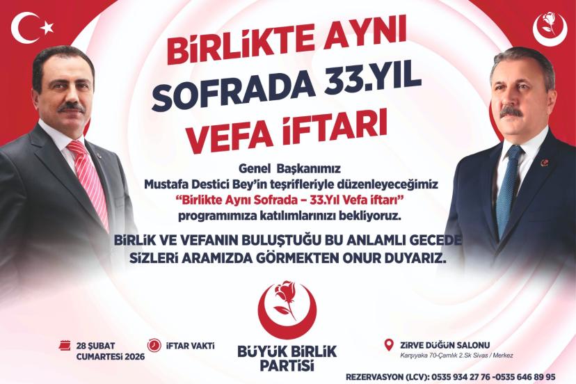 Büyük Birlik Partisi Sivas’ta “Birlikte Aynı Sofrada 33. Yıl Vefa İftarı” Düzenliyor