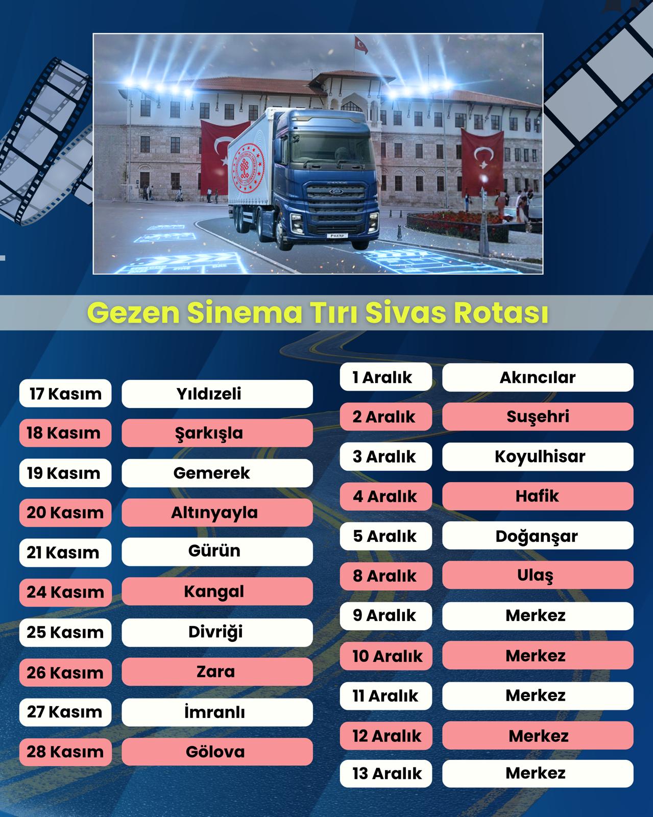 Gezici Sinema Tırı 17 Kasım-13 Aralık tarihleri arasında şehrimizin tüm ilçelerimize uğrayacak. 24 gün boyunca Sivas’ta kalacak Gezen Sinema tırının 20 binden fazla Sivaslıya ulaşması hedefleniyor.