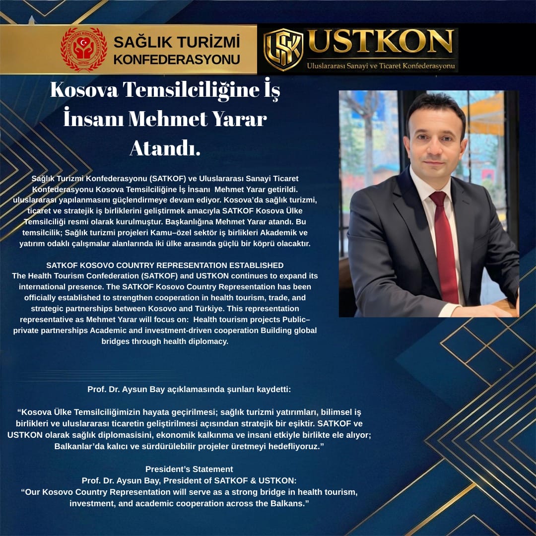 Sağlık Turizmi Konfederasyonu (SATKOF), uluslararası yapılanmasını güçlendirme hedefi doğrultusunda önemli bir adım daha attı. Kosova’da sağlık turizmi, ticaret ve stratejik iş birliklerini geliştirmek amacıyla SATKOF Kosova Ülke Temsilciliği resmi olarak kuruldu. Temsilciliğe Mehmet Yarar ülke temsilcisi olarak atandı.