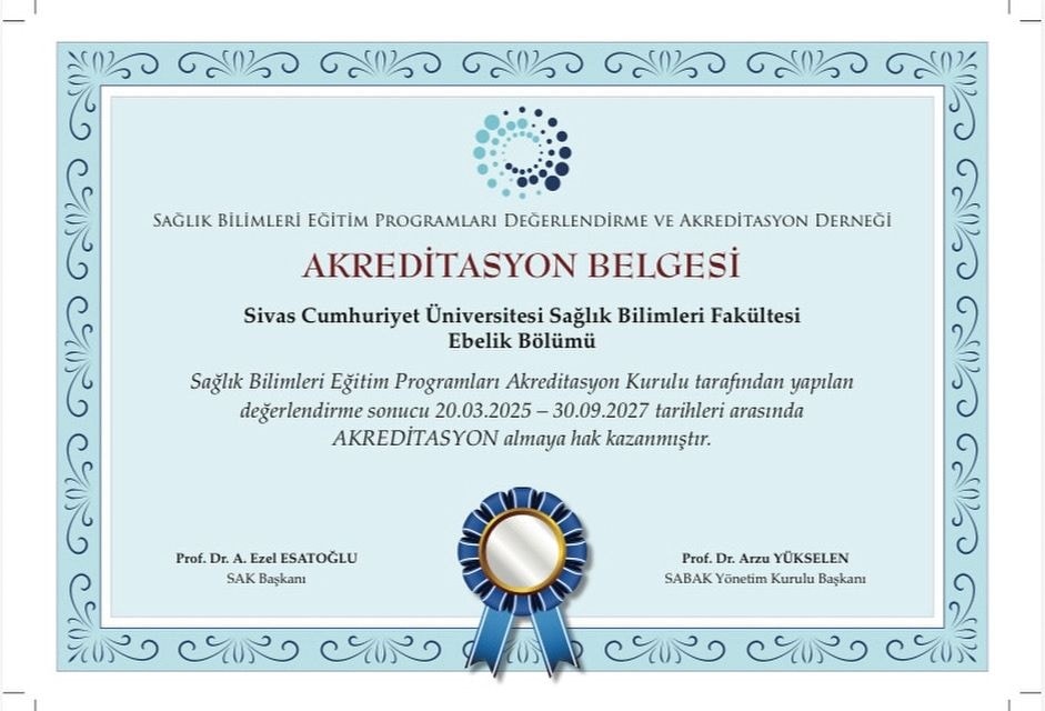 Sivas Cumhuriyet Üniversitesi Sağlık Bilimleri Fakültesi Ebelik Bölümü, Sağlık Bilimleri Eğitim Programları Değerlendirme ve Akreditasyon Derneği (SABAK) tarafından gerçekleştirilen titiz bir değerlendirme süreci sonucunda, 20 Mart 2025 – 30 Eylül 2027 tarihleri arasında geçerli olmak üzere yeniden akreditasyon almaya hak kazandı.