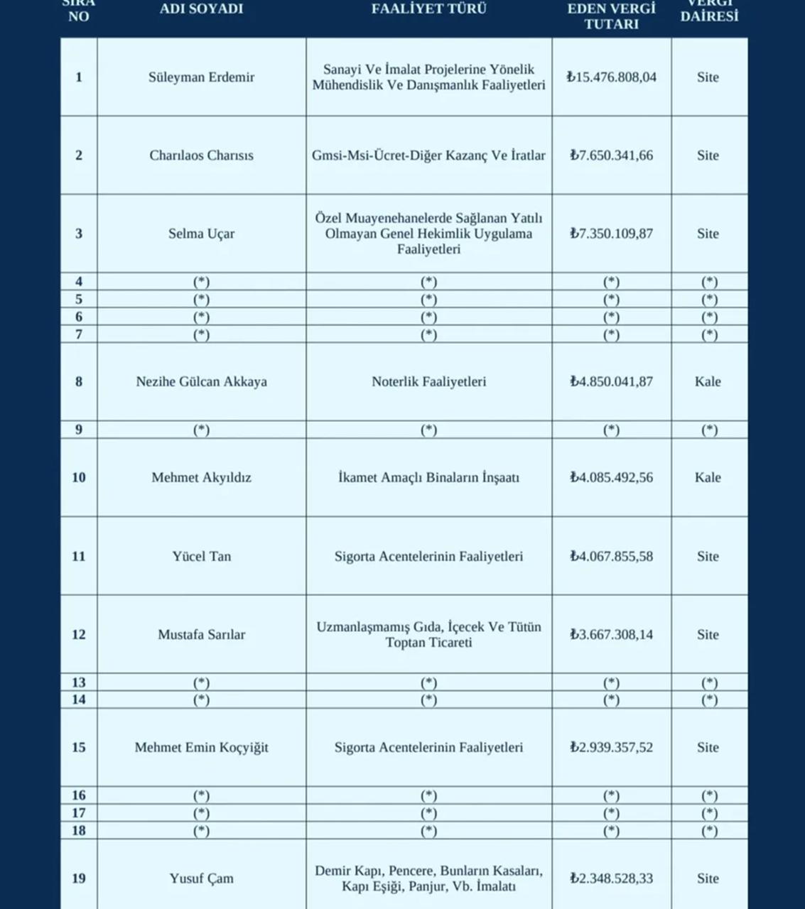 Sivas Vergi Dairesi Başkanlığı tarafından açıklanan 2024 yılı vergi rekortmenleri listesinde, Yunan orta saha oyuncusu 7 milyon 650 bin lira vergi ödeyerek ikinci sırada yer aldı.