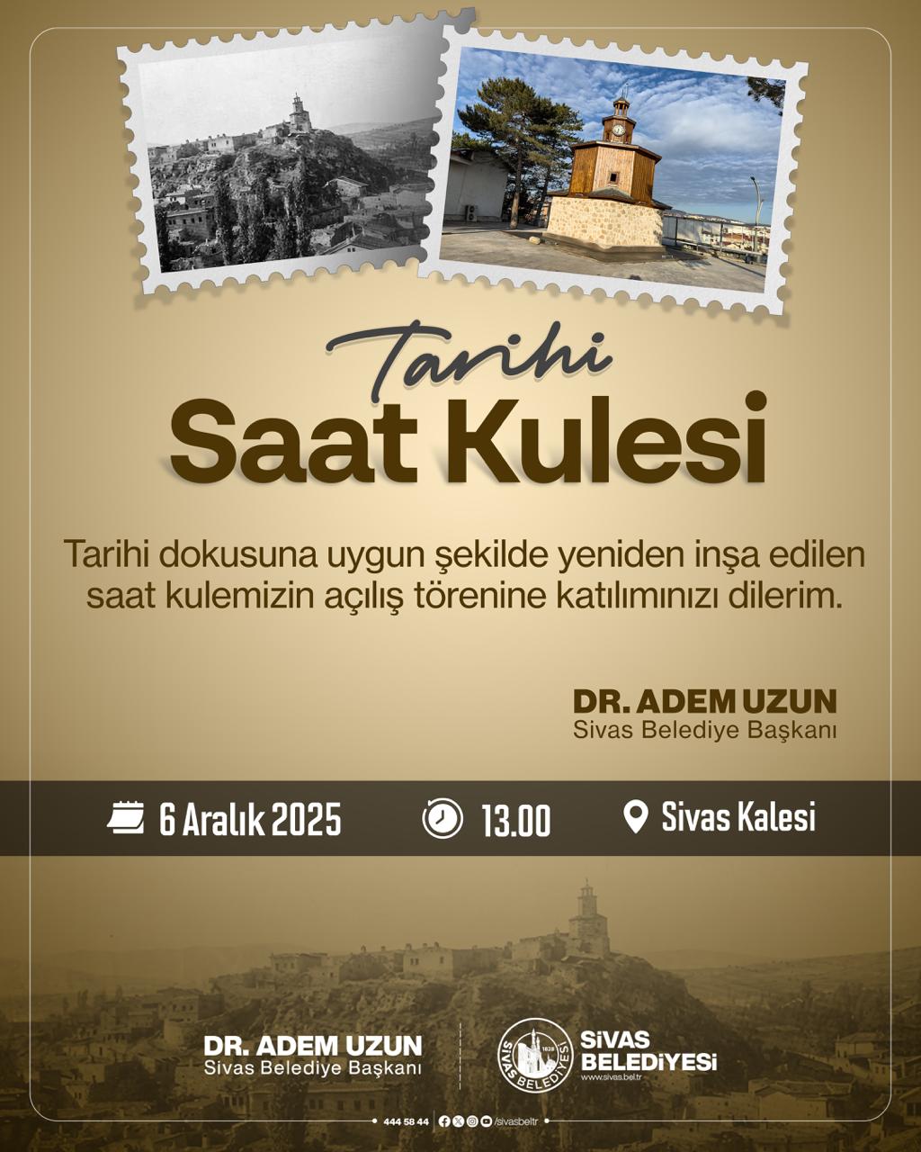 Sivas Belediyesi tarafından tarihi dokusuna uygun şekilde yeniden inşa edilen Tarihi Saat Kulesi, düzenlenecek törenle resmi olarak hizmete açılacak. Kentin önemli sembollerinden biri olan yapının restorasyon süreci tamamlanarak eski görünümüne kavuştu.